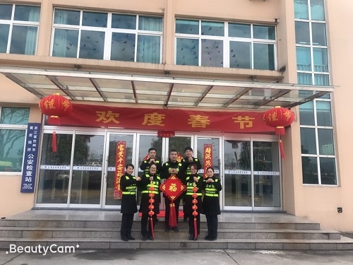 圖為布置好的辦公樓現場 下午,大家對管理房辦公樓道的蜘蛛網進行了清理,對大門口進行布置:掛起燈籠、貼上對聯、拉好橫幅和彩旗。考慮到春節期間保潔員放假,生活垃圾較以往會有所增加,特在各角落多增放了幾只垃圾桶。 負責掃塵的同事認真對待,干勁十足。在大家的共同努力下,經過掃塵后的所面貌煥然一新,節日的氛圍較為濃厚。該所負責人要求大家尊重今天的勞動果實,春節期間繼續做好保潔工作。最后,大家即興在大門口合了影,并送上新年的祝福,擁抱充滿希望的2019年! 夏蓮萍