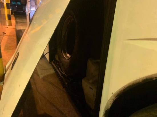 圖為被物品擠開(kāi)的客車側(cè)門 此次事故由于客車車箱內(nèi)放置過(guò)多的物品,在車箱門邊上還硬塞了幾只大輪胎,最終導(dǎo)致輪胎將側(cè)門擠開(kāi)而沒(méi)被司機(jī)發(fā)現(xiàn),在高速過(guò)ETC車道時(shí)箱門撞到了設(shè)備,司機(jī)對(duì)此也是后悔不已。 近期,收費(fèi)站發(fā)生過(guò)不少同類事件,有司機(jī)通過(guò)ETC車道時(shí)因車速過(guò)快未感應(yīng)到線圈,擋風(fēng)玻璃撞到欄桿;有集裝箱后門沒(méi)關(guān)撞到ETC設(shè)備。在此提醒過(guò)往司乘行車前務(wù)必要檢查好車輛安全情況,過(guò)ETC車道需要慢行。如果在高速上出現(xiàn)突發(fā)情況也不要慌張,及時(shí)向工作人員或者撥打求助電話請(qǐng)求幫助。 楊相暖