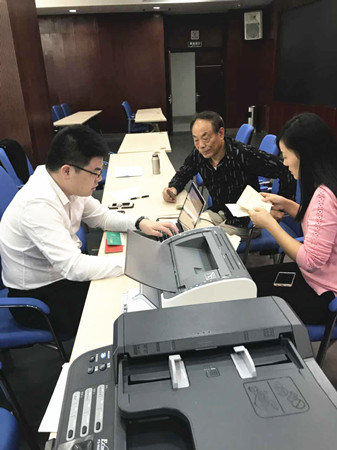 戴著一副黑框眼鏡,憨實魁梧的身形,說話輕言慢語。據(jù)說,某天下班后,還坐在椅子上打電話,一臉溫柔,竊竊私語,同事一直以為他在談戀愛,這打完了電話,才知道是接到股東的電話了,跟對方在解釋股權(quán)收購政策呢。 在股權(quán)流動收購點,小李是電腦操作人員,所以也不大參與解說工作。只是那天正好一位阿婆坐在了電腦對面,說話之間才知大字不識,是聽鄰居說的,就自己摸到這里了。正好手里也空了,李騰飛頓頓身子,放松下來,以黃巖特有的吳言儂語跟阿婆解釋了十幾分鐘,果然,白凈的臉上是一臉的和氣,沉穩(wěn)又實在,確實是傳說中的暖男一枚呀。末了,幫阿婆代簽了字,讓阿婆按了手指印。 但是,在工作的時候,小李讓我們見識到了“騰飛”的效果。流動點只設一臺筆記本電腦,線上操作都歸他,在大溪鎮(zhèn)政府,來的股東有百十號,流動小組包括駕駛員何杰靚迅速開展了流水作業(yè)。此時此刻,小李那一雙肥白的大手在小巧的鍵盤上十指翻飛,靈活敏捷,操作如行云流水,打印機刷刷地響,不停飛出一份份協(xié)議,傳到下一個工作人員這里。這才知道,每一個人的名字都是名副其實的,“騰飛”的含義是在這里體現(xiàn)的呀。 鄭蔚
